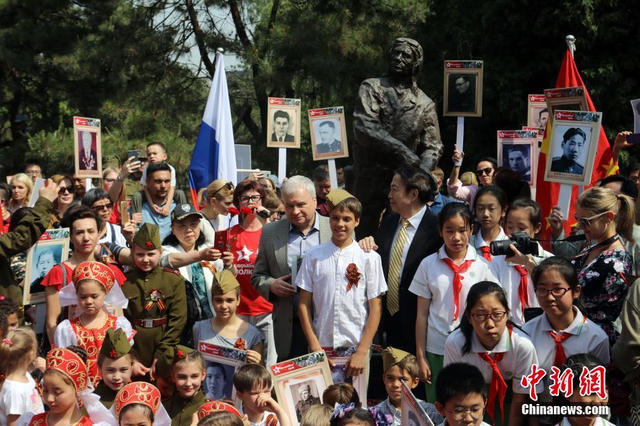 5月9日,中俄友好人士向北京朝阳公园内的“苏联之鹰”雕像献花。当日,为纪念俄罗斯卫国战争胜利73周年,由中俄友人组成的“不朽军团”行进活动在北京朝阳公园举行。 中新社记者 李国庆 摄