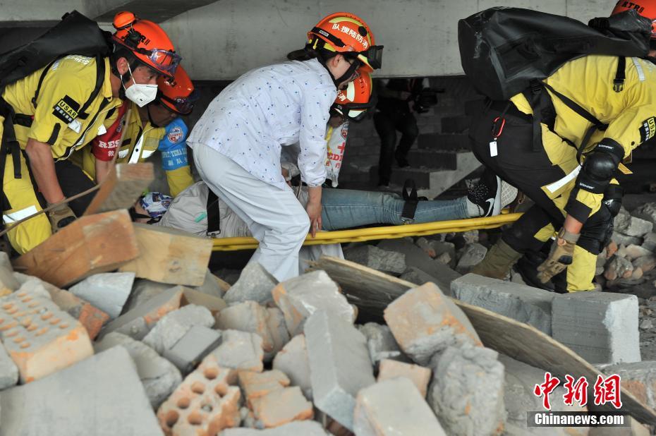救援队员及医务人员正在废墟中抬出“受伤”民众。 中新社记者 张茵 摄