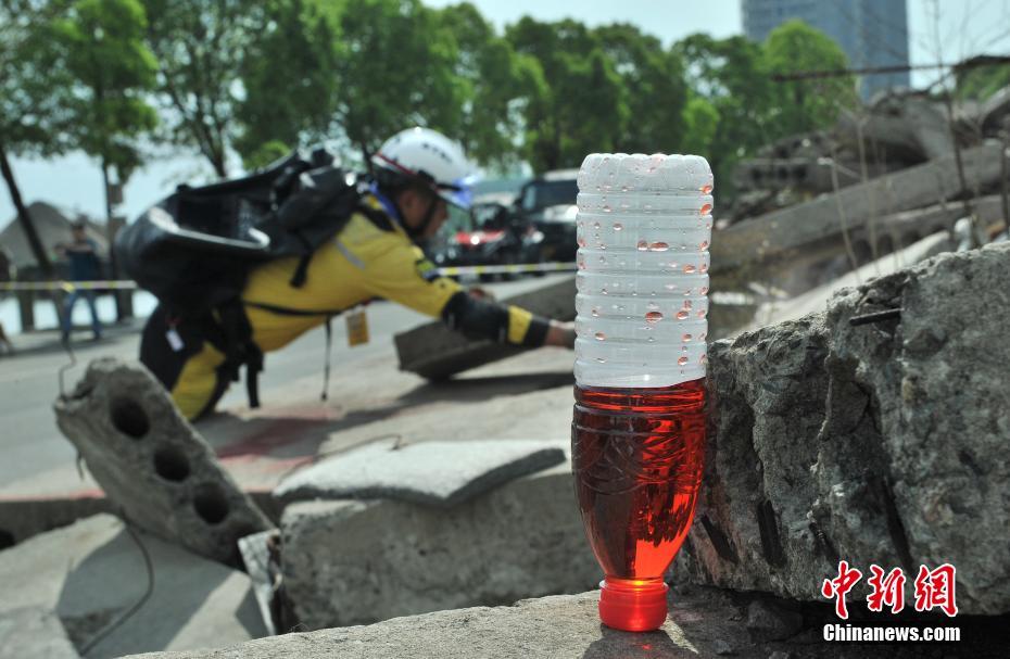 5月10日,废墟上摆放着一瓶预防余震的水。 中新社记者 张茵 摄
