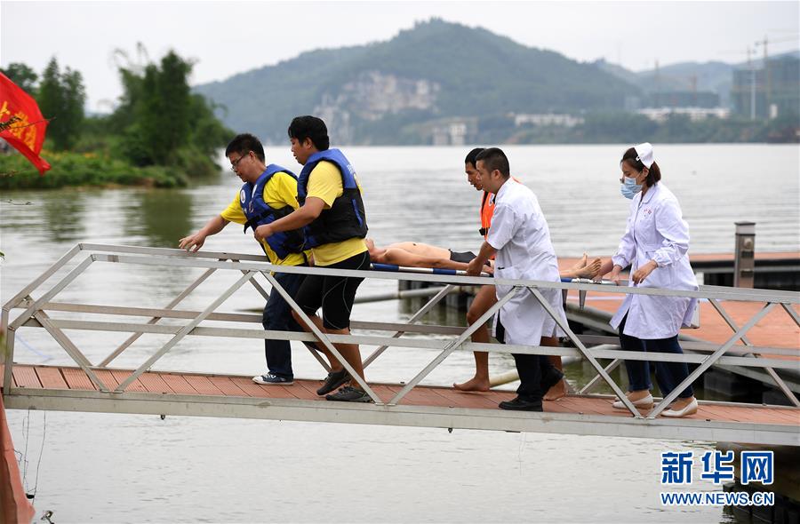 5月10日,救援人员在应急演练中救助“落水者”。当日,2018年广西柳州自然灾害应急救助联合演练在柳州市区柳江水域展开。演练模拟当地突发洪涝灾害,参演的应急救援保障队伍围绕相关救援项目进行演练,以提升多部门联合应急抢险能力。新华社发 黎寒池 摄