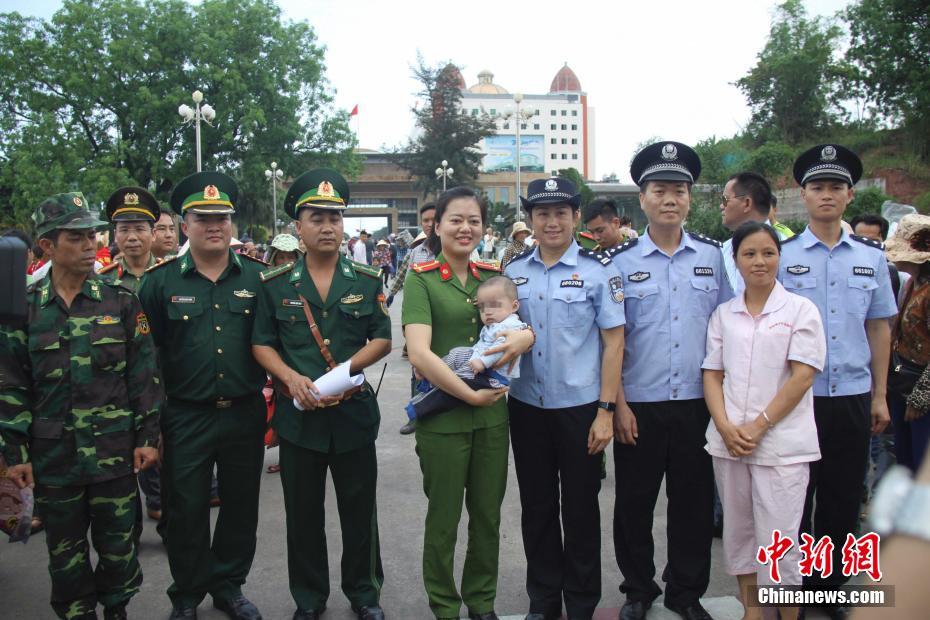 5月11日,广西防城港市公安局刑事侦查部联合东兴市公安局刑侦大队将一名被拐卖到中国的越南籍男婴移交给越南广宁省芒街市公安局。图为中越警方移交男婴。中新社发 黄卓 摄
