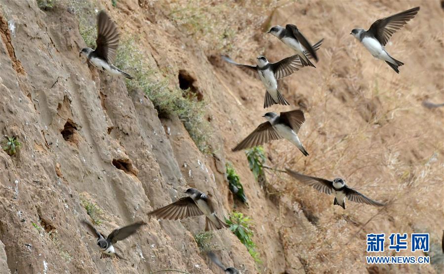 近日,河南新郑市庆安路一施工工地旁的沙质崖壁引来数千只崖沙燕挖洞筑巢,繁衍后代。目前该处工地已经停止施工。当地林业局设立起保护警戒线,确保雏鸟离巢前不受打扰。新华社发(李嘉南 摄)