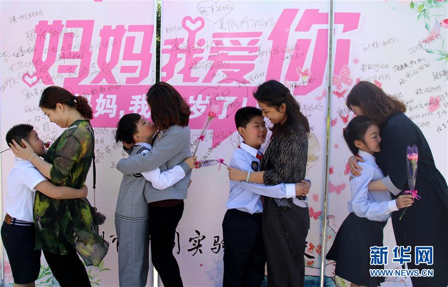 5月11日,江苏省苏州市金阊实验小学校的学生们在母亲节主题活动上拥抱妈妈。