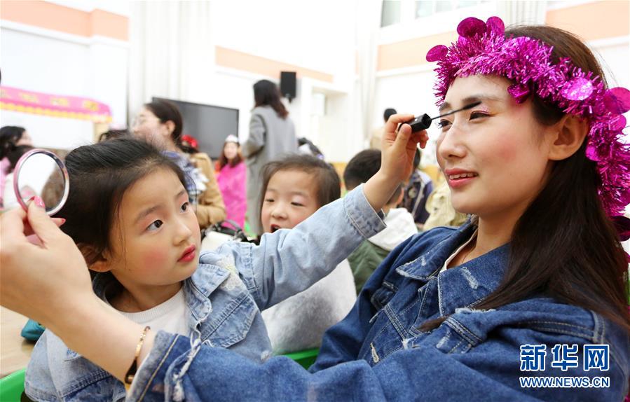5月11日,江苏省东海县幼儿园的一名小朋友在母亲节主题活动上给妈妈化妆。 新华社发(张开虎 摄)