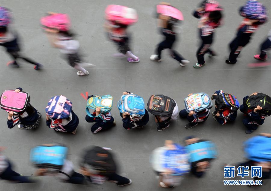 5月11日,河北省邯郸市光明南小学的学生在防震演练中紧急疏散。新华社发(郝群英 摄)