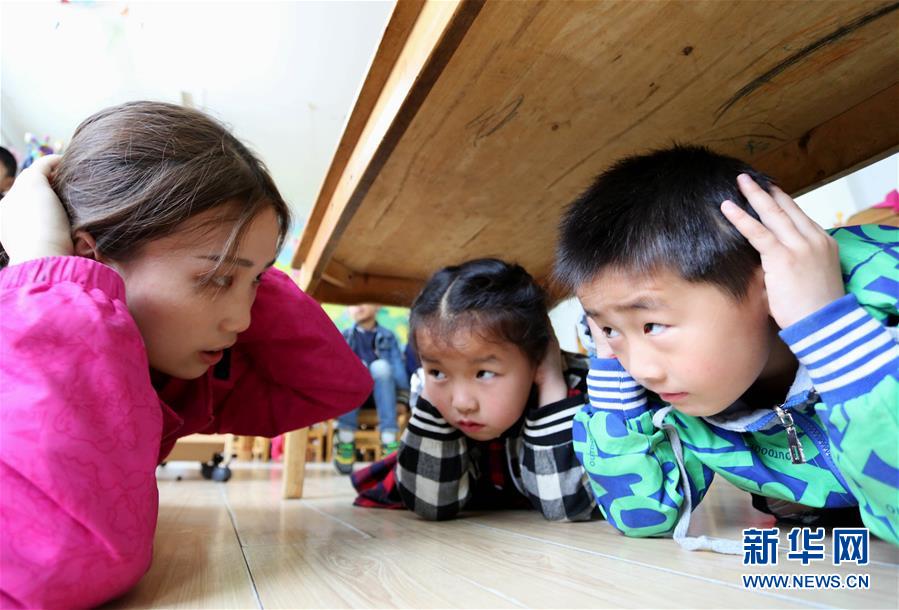 5月11日,江苏东海县第二幼儿园的老师指导学生进行地震防灾应急避险演练。新华社发(张开虎 摄)