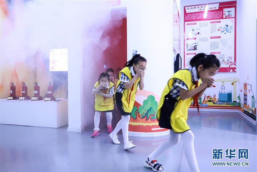 5月11日,在河北石家庄公共安全体验馆,石家庄市槐安西路小学学生体验如何在火灾中逃生。新华社发(刘沛然 摄)