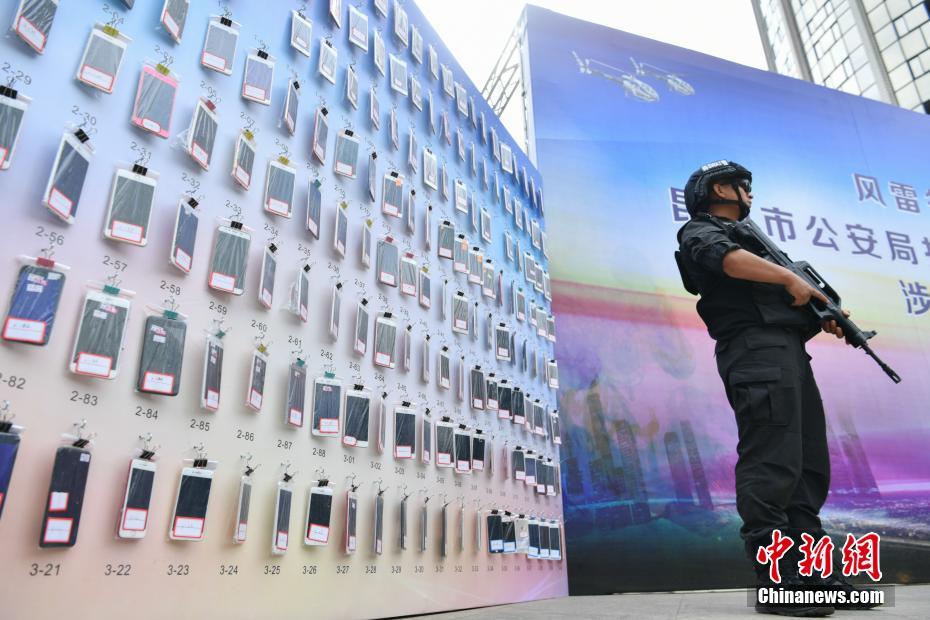 今日将第一批查证核实的400余部手机和物品集中发还给受害者。图为昆明警方将扣押的涉案手机挂在宣传栏上,等待受害人认领。 中新社记者 任东 摄
