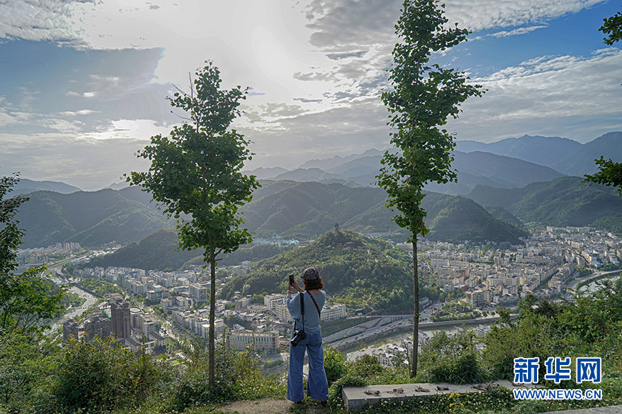2018年5月11日,一名女士在拍摄四川省青川县县城景色。新华社记者 才扬 摄