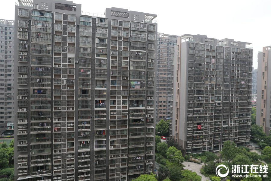 杭州下沙一小区里,为了防止家里的小孩跌落,整幢高层住宅几乎都安装了防盗窗,远远看去十分壮观。(浙江在线记者 王建龙 王夷 摄)