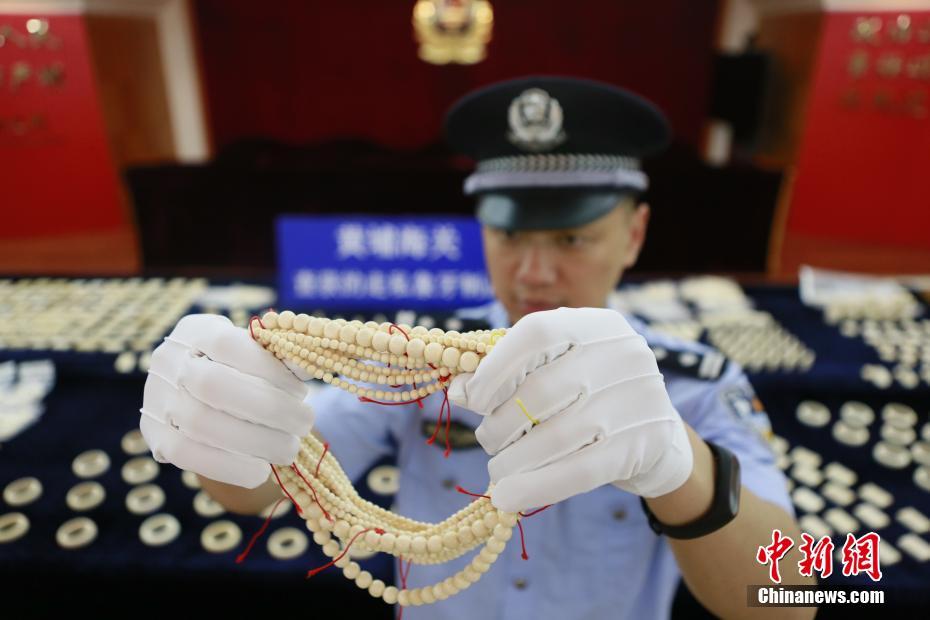 5月14日,记者从黄埔海关获悉,该关缉私局日前查获1起涉嫌走私进口象牙制品案,经清点,此次行动查扣涉案象牙制品共计740件,共计28.83公斤,其中非洲象牙制品15.72公斤、猛犸象牙制品13.11公斤,抓获犯罪嫌疑人2名。该案为今年世界国际刑警组织发起、公安部牵头参与的打击濒危野生动物非法贸易“雷雨行动”以来,黄埔海关查获的首宗象牙制品走私进口案。图为黄埔海关查获的走私象牙制品。中新社记者 张海龙 摄