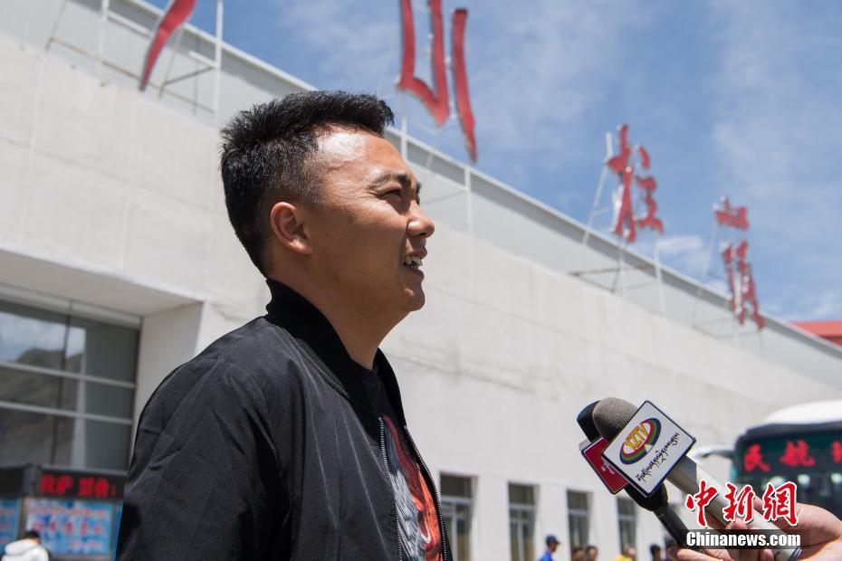 5月14日,3U8633重庆至拉萨航班因机械故障备降成都。此后,川航安排3U8695执行成都至拉萨航班。该航班已于14时许抵达拉萨贡嘎国际机场,部分旅客顺利抵藏。图为原3U8633航班旅客潘先生在拉萨贡嘎国际机场接受采访。中新社记者 何蓬磊 摄