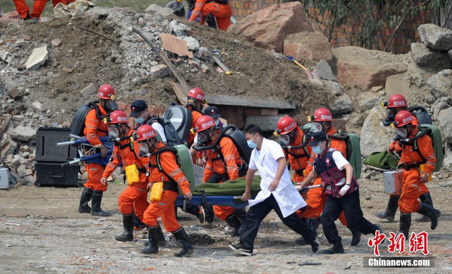5月16日,“地震”现场矿山救援队救出一名“伤者”。当日,2018年四川省抗震救灾综合演练在德阳广汉市举行,此次演练主要展示空中应急抢险救援。中新社发 刘忠俊 摄