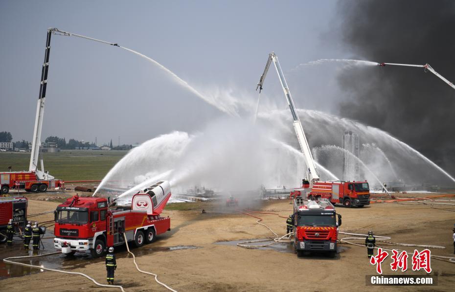 5月16日,演练现场危化品泄漏爆炸大火被成功扑灭。当日,2018年四川省抗震救灾综合演练在德阳广汉市举行,此次演练主要展示空中应急抢险救援。中新社发 刘忠俊 摄