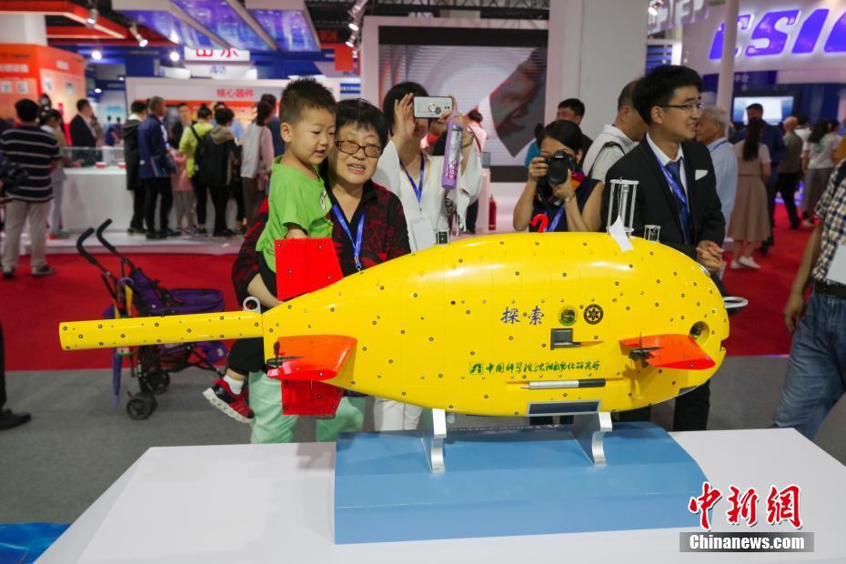5月17日,第二十一届中国北京国际科技产业博览会在中国国际展览中心开幕。本届科博会有1600多家科技企业参展。联合国工业发展组织、加拿大、法国、德国、美国等14个国家和地区的17个代表团出席科博会各类活动。图为“探索4500”水下机器人模型。该机器人能够水下续航20小时,工作水深达4500米。中新社记者 贾天勇 摄