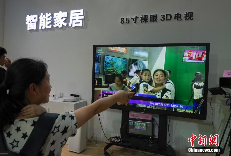5月17日,第二十一届中国北京国际科技产业博览会在中国国际展览中心开幕。本届科博会有1600多家科技企业参展。联合国工业发展组织、加拿大、法国、德国、美国等14个国家和地区的17个代表团出席科博会各类活动。图为某智能家居展商的裸眼3D电视引起观众注意。中新社记者 贾天勇 摄