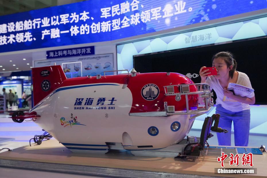 5月17日,第二十一届中国北京国际科技产业博览会在中国国际展览中心开幕。本届科博会有1600多家科技企业参展。联合国工业发展组织、加拿大、法国、德国、美国等14个国家和地区的17个代表团出席科博会各类活动。图为观众参观“深海勇士”号载人潜水器模型。“深海勇士”号是拥有自主知识产权的4500米级载人潜水器,也是中国继“蛟龙”号之后第二台深海载人潜水器。中新社记者 贾天勇 摄