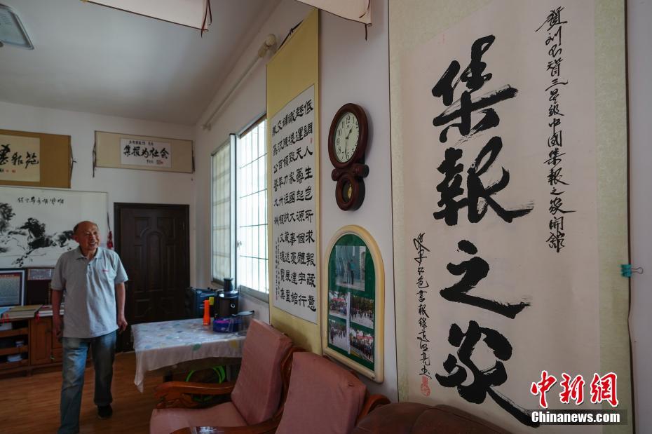 5月17日,刘玉智藏报馆墙上挂着好友赠送的书法作品。位于贵阳市南明区永乐乡的刘玉智藏报馆,由300平方米的展馆、200平方米的收藏馆和100平方米的仓库组成。刘玉智1963年开始藏报,55年来收集华文报纸5万多种、50多万份,从清末至今,时间跨度百余年,涵盖了政治、军事、经济、文化、商业、工业、体育等各种专题,《国民日报》、《救国报》、《新华日报》、《解放日报》等具有很高收藏价值的报纸,伞报、金报、生肖报、寿报、“中国第一小报”等制作新颖的报纸也陈列其中。中新社记者 贺俊怡 摄