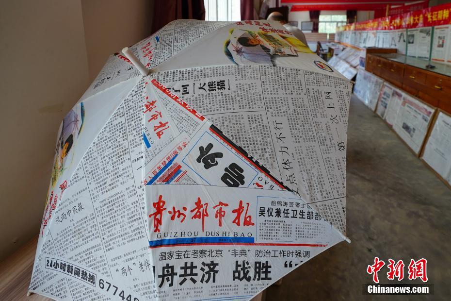 5月17日,贵阳市南明区,刘玉智藏报馆展出的伞报。位于贵阳市南明区永乐乡的刘玉智藏报馆,由300平方米的展馆、200平方米的收藏馆和100平方米的仓库组成。刘玉智1963年开始藏报,55年来收集华文报纸5万多种、50多万份,从清末至今,时间跨度百余年,涵盖了政治、军事、经济、文化、商业、工业、体育等各种专题,《国民日报》、《救国报》、《新华日报》、《解放日报》等具有很高收藏价值的报纸,伞报、金报、生肖报、寿报、“中国第一小报”等制作新颖的报纸也陈列其中。中新社记者 贺俊怡 摄