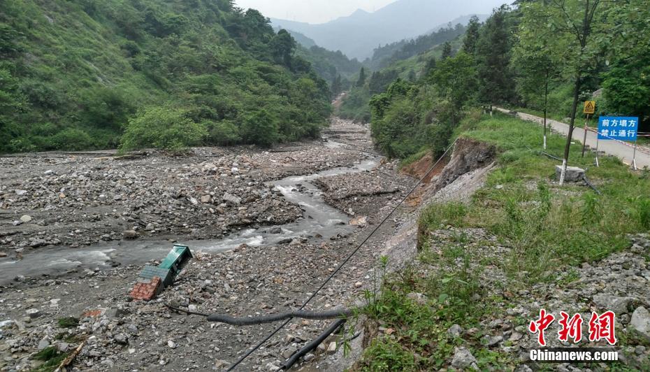 5月23日至25日,国网乐山供电公司派出的抢险人员全力抢通暴雨中受损的四川峨眉山市乐都镇新沟村输电线路,因暴雨灾害新沟村道路、电力、通讯均中断,成了一座孤岛。25日,暴雨灾害后第四天,前往新沟村沿途一片繁忙,电力抢险人员正全力抢通受损的电力线路,地质专家们也正抓紧评估山体情况,村民们自发走出大山将粮食等物资背回村子。塌方的路边,60岁的村民张明甫戴着红袖章坚守在塌方段负责安全。“这辈子都没有见过这么大的水!”张明甫称,新沟村有6个村民小组,约240多人,多为中老年人。灾情发生后,国网乐山供电公司派出抢险人员奔赴受灾较重的新沟村,对受损断电的电力电缆进行分段测试,判断电缆受损程度确定抢险方案。“前往新沟村的道路垮塌严重,路上不时有飞石出现,十分危险。”国网乐山供电公司何小飞边走边不时提醒身边的同事,一定要注意安全。何小飞表示,经现场调查,已基本掌握电力电缆受损情况,抢修方案明确后,将尽快恢复新沟村的用电。目前,新沟村受损道路、电力、通讯等抢通工作正在紧张进行,政府相关部门派出的人员深入村子开展安抚和灾后安置等。图为河道中被冲毁的供电设施。 文惊涛 摄
