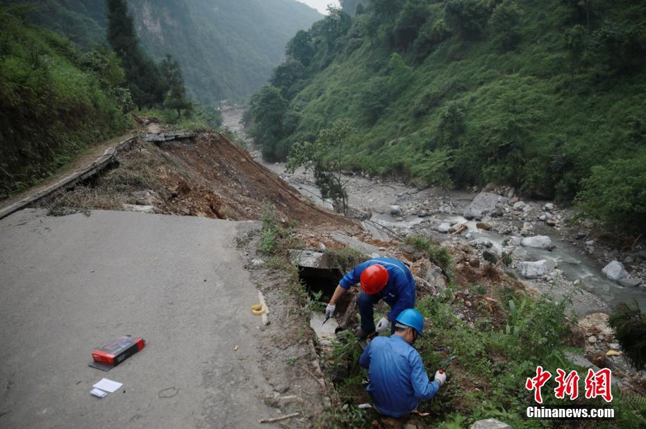5月23日至25日,国网乐山供电公司派出的抢险人员全力抢通暴雨中受损的四川峨眉山市乐都镇新沟村输电线路,因暴雨灾害新沟村道路、电力、通讯均中断,成了一座孤岛。25日,暴雨灾害后第四天,前往新沟村沿途一片繁忙,电力抢险人员正全力抢通受损的电力线路,地质专家们也正抓紧评估山体情况,村民们自发走出大山将粮食等物资背回村子。塌方的路边,60岁的村民张明甫戴着红袖章坚守在塌方段负责安全。“这辈子都没有见过这么大的水!”张明甫称,新沟村有6个村民小组,约240多人,多为中老年人。灾情发生后,国网乐山供电公司派出抢险人员奔赴受灾较重的新沟村,对受损断电的电力电缆进行分段测试,判断电缆受损程度确定抢险方案。“前往新沟村的道路垮塌严重,路上不时有飞石出现,十分危险。”国网乐山供电公司何小飞边走边不时提醒身边的同事,一定要注意安全。何小飞表示,经现场调查,已基本掌握电力电缆受损情况,抢修方案明确后,将尽快恢复新沟村的用电。目前,新沟村受损道路、电力、通讯等抢通工作正在紧张进行,政府相关部门派出的人员深入村子开展安抚和灾后安置等。 文惊涛 摄