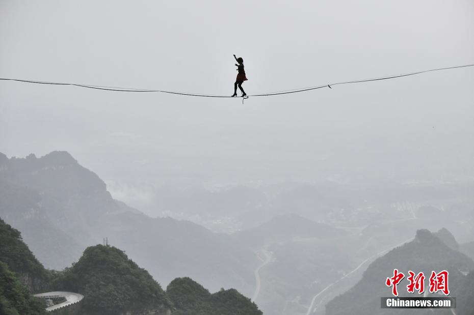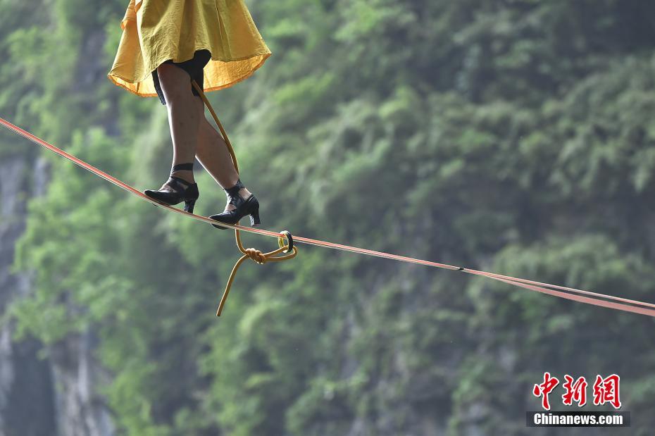 选手身着高跟鞋在高空扁带上行走。邵颖 摄