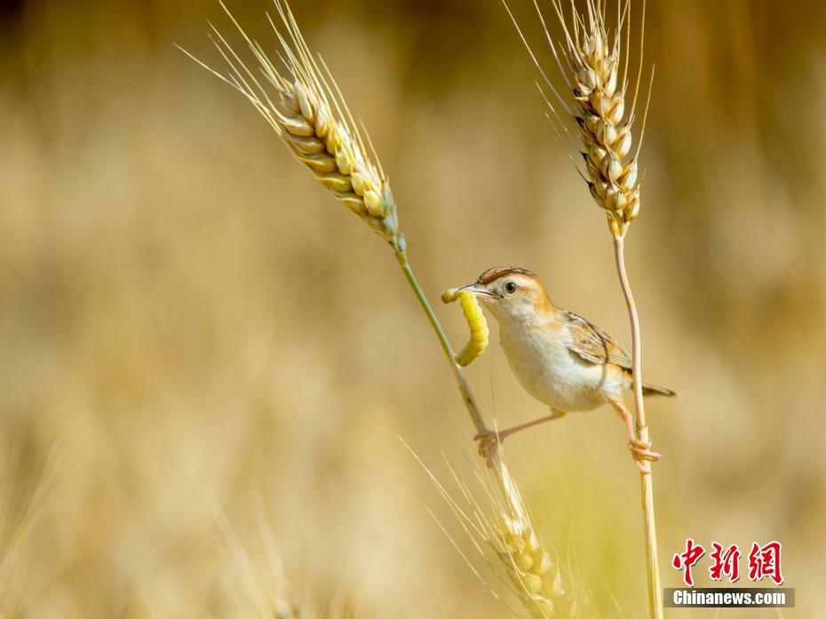 走近细看,小巧玲珑的棕扇尾莺,在麦穗上表演“轻功”,精神抖擞地捉虫。宋广兴 摄