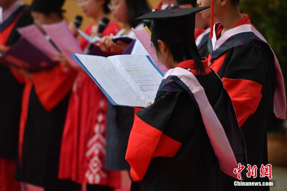 6月1日,毕业班的孩子们和老师一起朗诵诗歌。当日是“六一”国际儿童节,云南省昆明市盘龙区培智学校特殊的孩子们在老师、家长和爱心人士的陪伴下,唱歌跳舞,度过和普通孩子一样快乐的节日。学校负责人表示,希望全社会一起关爱特殊儿童,让他们健康成长。中新社记者 刘冉阳 摄