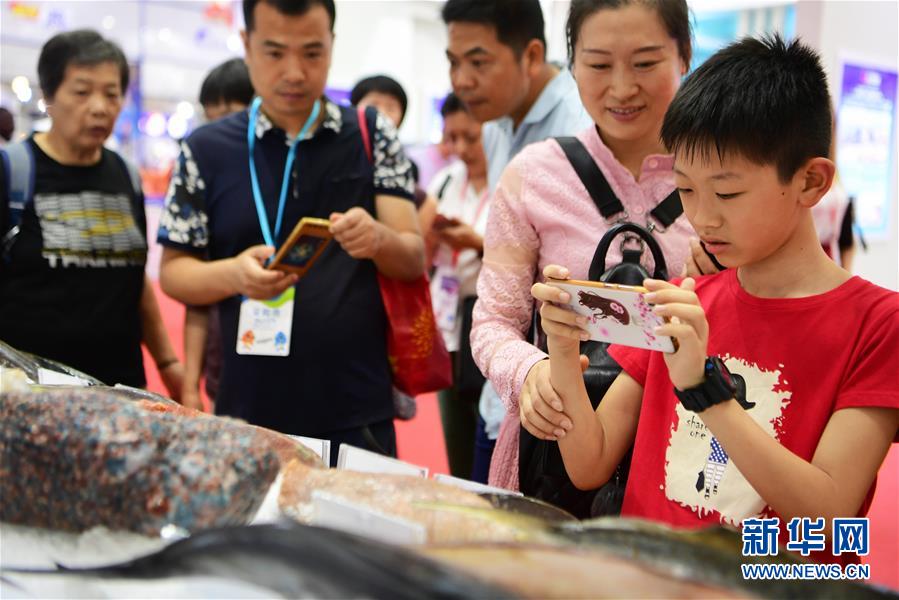 6月1日,在福州海峡国际会展中心,观众在拍摄各种各样的海洋鱼类。新华社记者 魏培全 摄