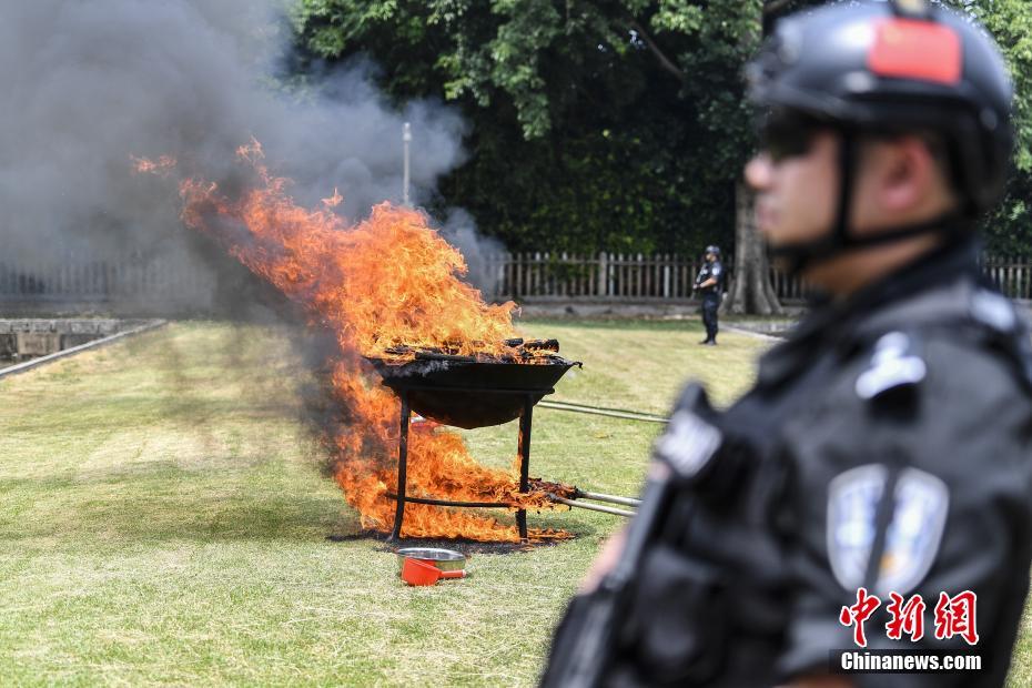 6月3日,“健康人生·绿色无毒”广东省“6·3”虎门销烟纪念日活动在广东东莞举行。活动通过毒品模拟实物展示、禁毒图片巡展展板、现场销毁毒品等方式向民众集中展示近年来广东禁毒工作成果。图为销毁毒品仪式现场。中新社记者 陈骥旻 摄