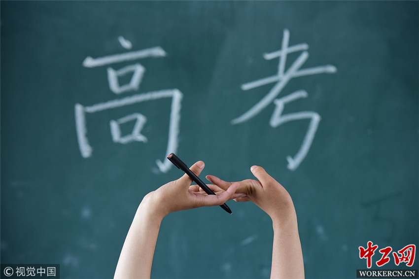 2018年6月3日,在安徽阜阳市三中,即将参加高考的一名高三学生在复习功课间隙伸懒腰。