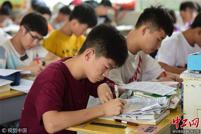 2018年6月3日,在安徽阜阳市三中,即将参加高考的高三学生在抓紧时间复习。