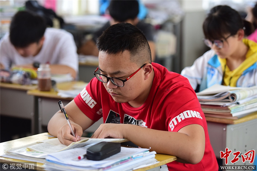 2018年6月3日,在安徽阜阳市三中,即将参加高考的高三学生在抓紧时间复习。