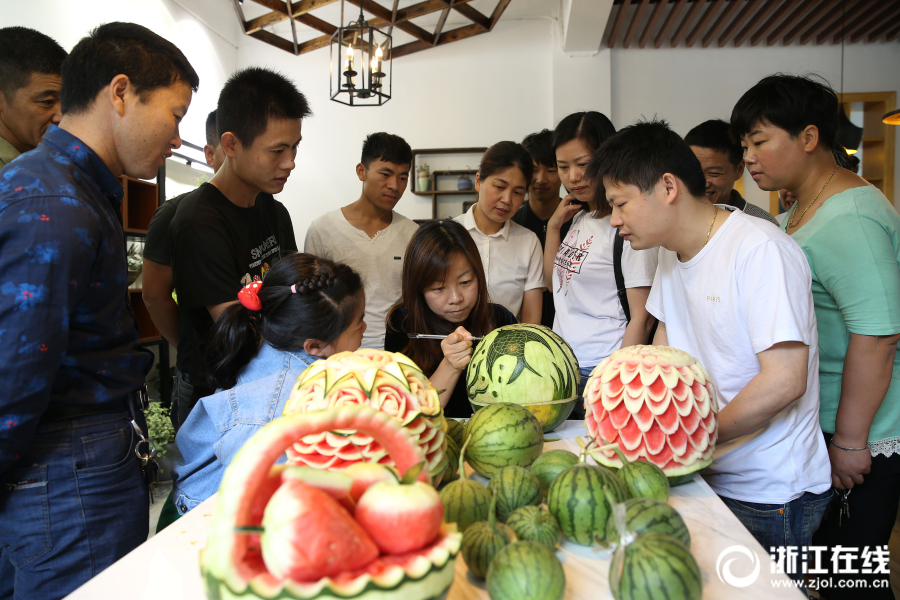6月3日,德清县雷甸镇成人文化技术学校的制作工坊内,当地村民正学习西瓜雕刻技术。普通的西瓜“盛开”富贵的牡丹花,这让整天与西瓜打交道的瓜农叹为观止。雷甸镇是当地有名的西瓜之乡,种植面积达2900多亩,为当地村民增收3000余万元。(浙江在线拍友 姚海翔 摄)