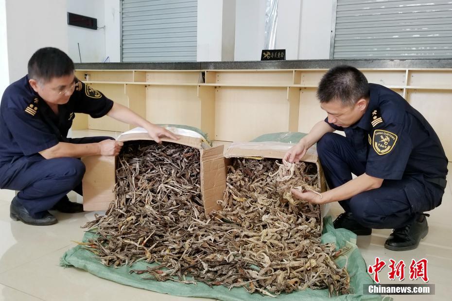 6月4日,南宁海关通报,其隶属凭祥海关近日在凭祥弄尧互市区行政通道,对一辆私家车进行检查时,发现涉嫌走私海马干31kg,数量约7750只。南宁海关介绍,海马干为水生动物产品,属于禁止携带进境物品,且属于《濒危野生动植物种国际贸易公约(CITES)》所列濒危物种。涉案当事人无法提供合法有效的进口手续,涉嫌走私违规。图为海关关员对海马干进行清点。中新社记者 林浩 摄