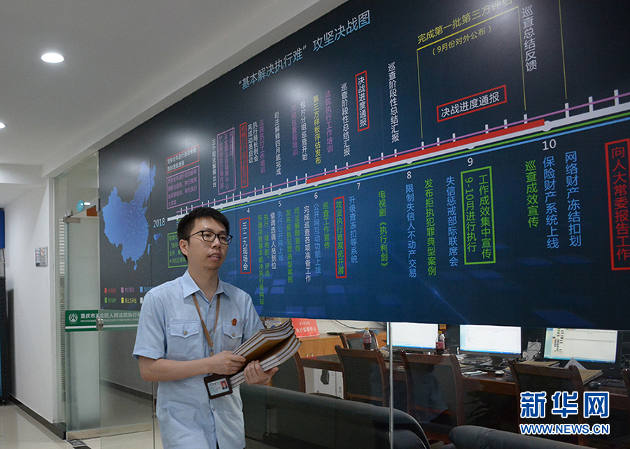 近年来,重庆各级法院加大执行力度。以渝北区法院为例,2017年执结18738件案件,执行到位金额52.1亿元。图为李长明带着执行材料快步走过“基本解决执行难”攻坚决战图前。新华网赵紫东 摄