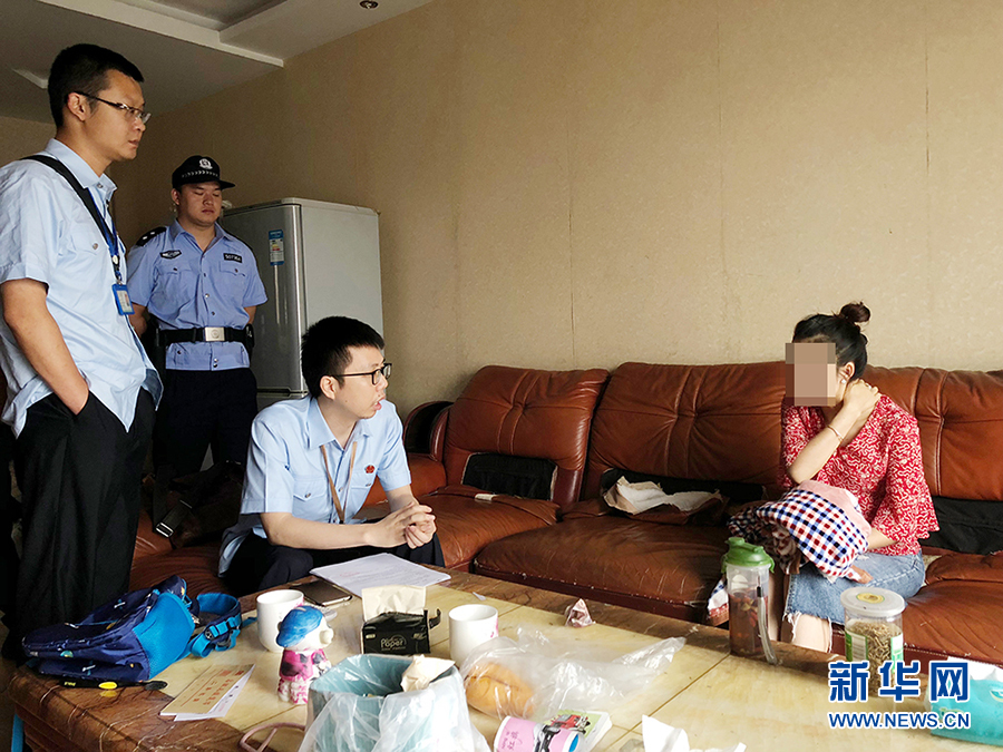 被执行人不在家,其妻子接待了郭旭(左一)和李长明(左三)。两位执行法官将此行目的告知被执行人妻子,房子将被拍卖,拍卖所得款项将用于偿还其欠款。李长明介绍,被执行人表示无力还款,没有其它可执行财产,所以只能将房屋进行司法拍卖偿还债务。考虑到被执行人的生活问题,法院将按规定在拍卖款中留出5到8年的租房费用供被执行人使用。新华网赵紫东 摄