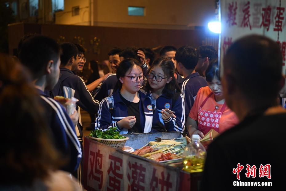 6月4日晚,晚自习下课,奋斗在书桌前的学子在校门口加餐补充能量,这些小吃摊贩大多是陪读家长。 韩苏原 摄