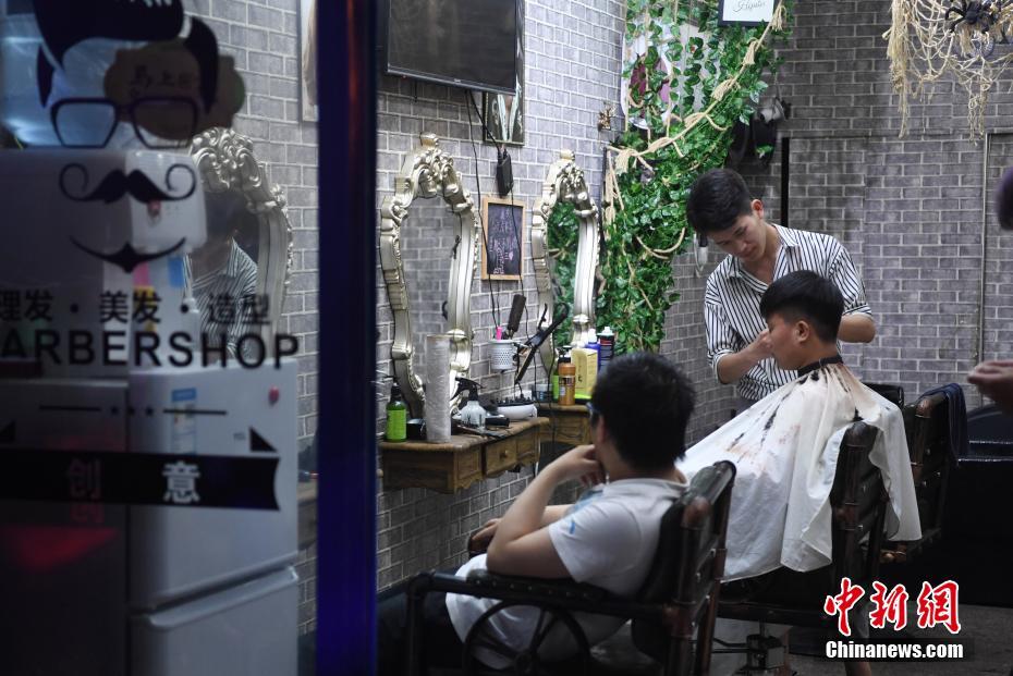 6月4日晚,理发师在给一名学生理发,忙碌的学习,学生只有下晚自习后才有时间理发。 韩苏原 摄