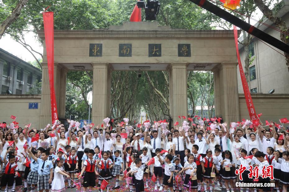 6月5日,从全国各地赶来的30对伉俪齐聚南京东南大学百年大礼堂前,在近千师生、海外留学生们的见证下,携手对母校“告白”,祝福该校复更名30周年、建校116周年华诞。据了解,这些伉俪中既有90多岁高龄、婚龄64年的“钻石婚夫妇”;也有即将步入婚礼殿堂的新婚夫妇;还有1984年考入“南京工学院”、1988年毕业于“东南大学”,经历、见证了学校复更名庆典的校友。南京东南大学是中国最早建立的高等学府之一,前身是创建于1902年的三江师范学堂,1921年正式建立国立东南大学,1928年改名为国立中央大学,1952年全国院系调整,在中央大学本部原址建立了南京工学院。1988年5月,学校复更名为东南大学。中新社记者 泱波 摄