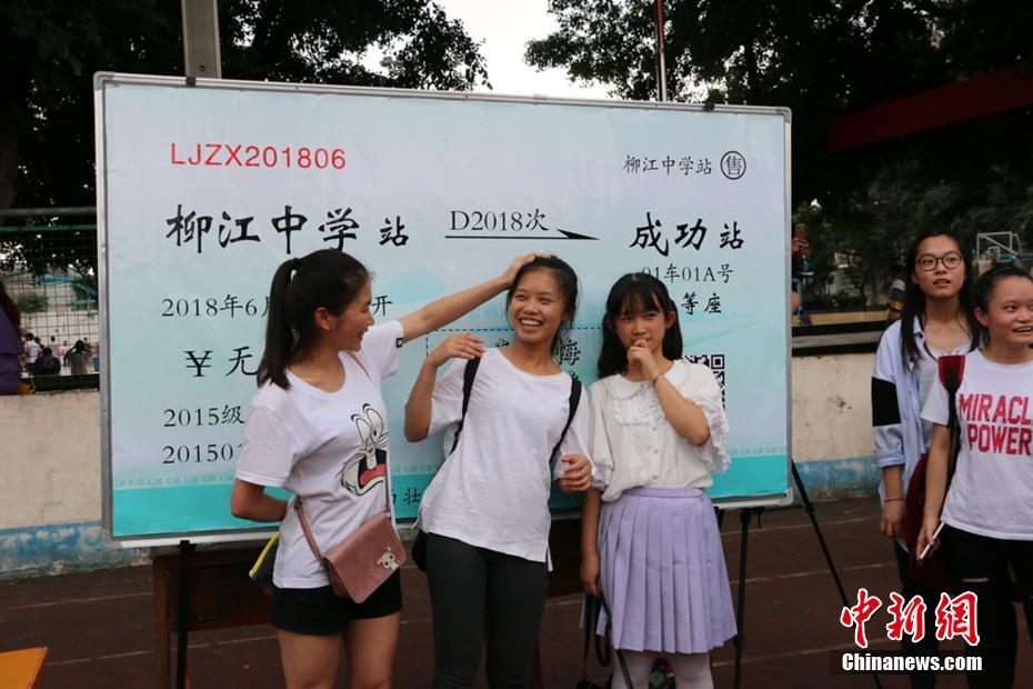 三名女生站在“成功站”的车票背景合影。林馨 摄