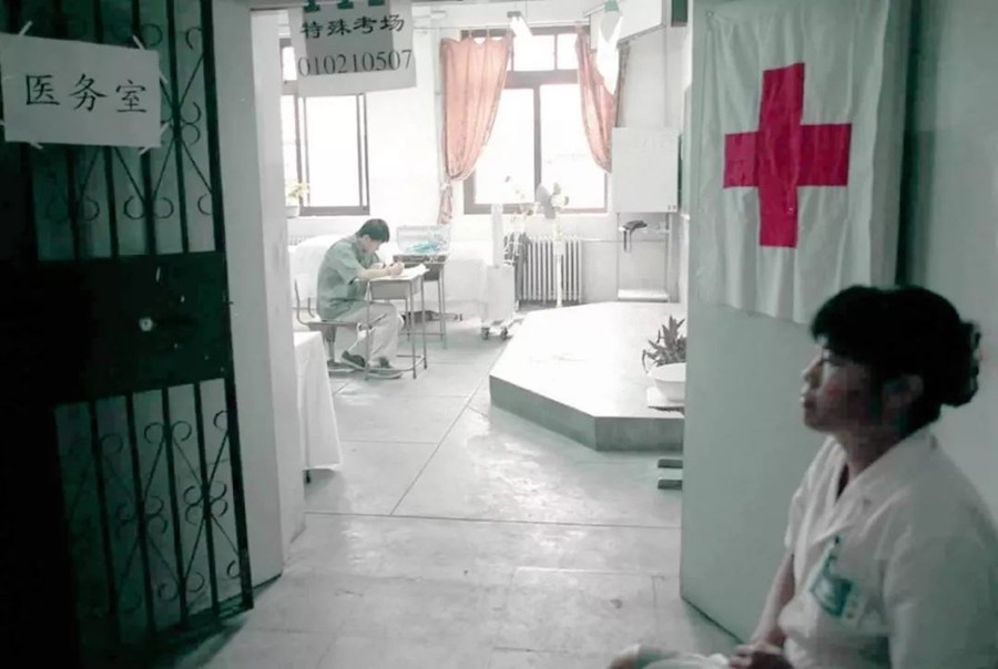 1999年7月7日,北京近5万名考生走进考场参加一年一度的高考。在北京市第二中学考点,北京市高招办特意为一名患有自发性气胸的考生陈迪扬安排了一间单人考场,单独配备了监考老师、医生和医疗设备。这是考生陈迪扬在特殊考场考试。自1999年开始,高等教育(包括大学本科、研究生)不断扩大招生人数的教育改革政策实施。(新华社记者 张旭 摄)