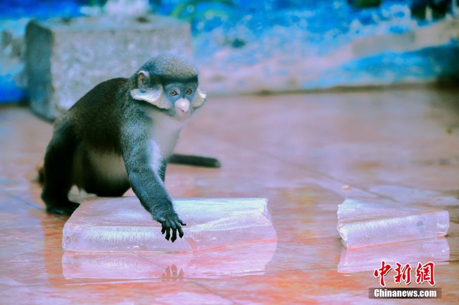 6月6日,天津动物园,一只灵长类动物玩冰降温。天津持续高温,动物园采取各种方式为动物防暑降温。 中新社记者 佟郁 摄
