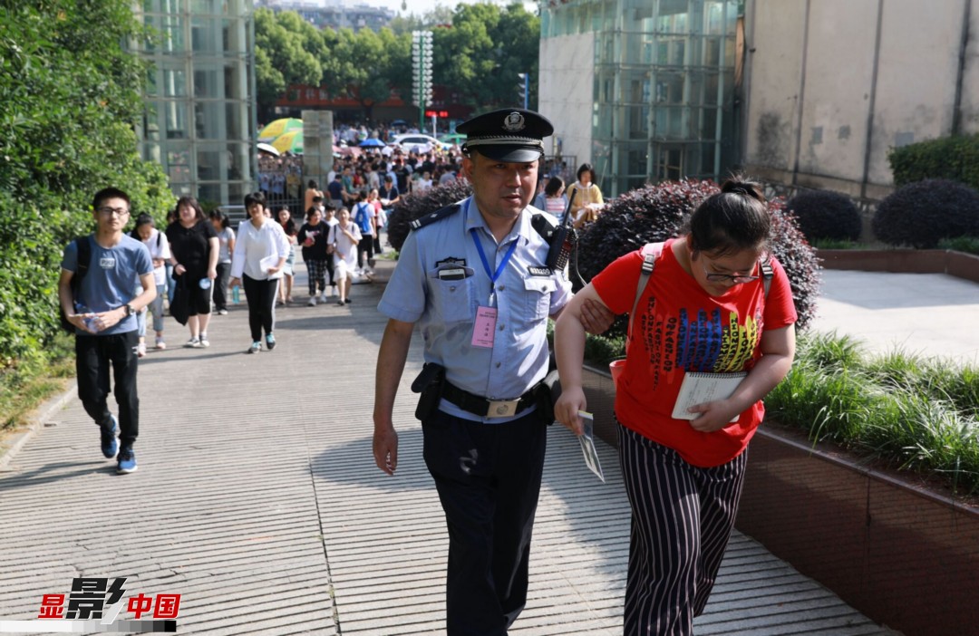 高考首日,一位不久前才做过阑尾炎手术的考生在民警的搀扶下进入安庆第二中学考点。新发网发 余平 摄