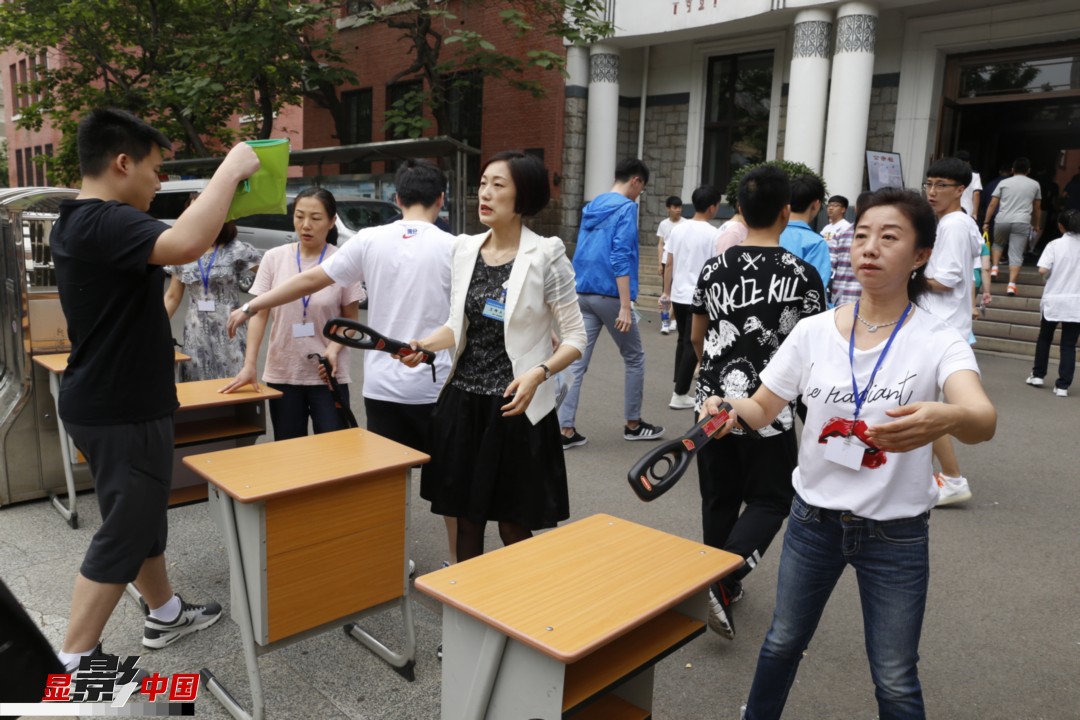 图为沈阳第二十中学考点,监考老师为考生进行安检。新华网姜冰摄