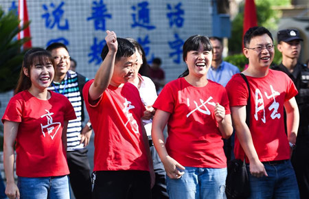 6月7日,在江苏南京市人民中学考点,一名送考老师手持“高考加油!”的牌子鼓励考生。 当日,2018年高考拉开帷幕。 新华社记者李博 摄