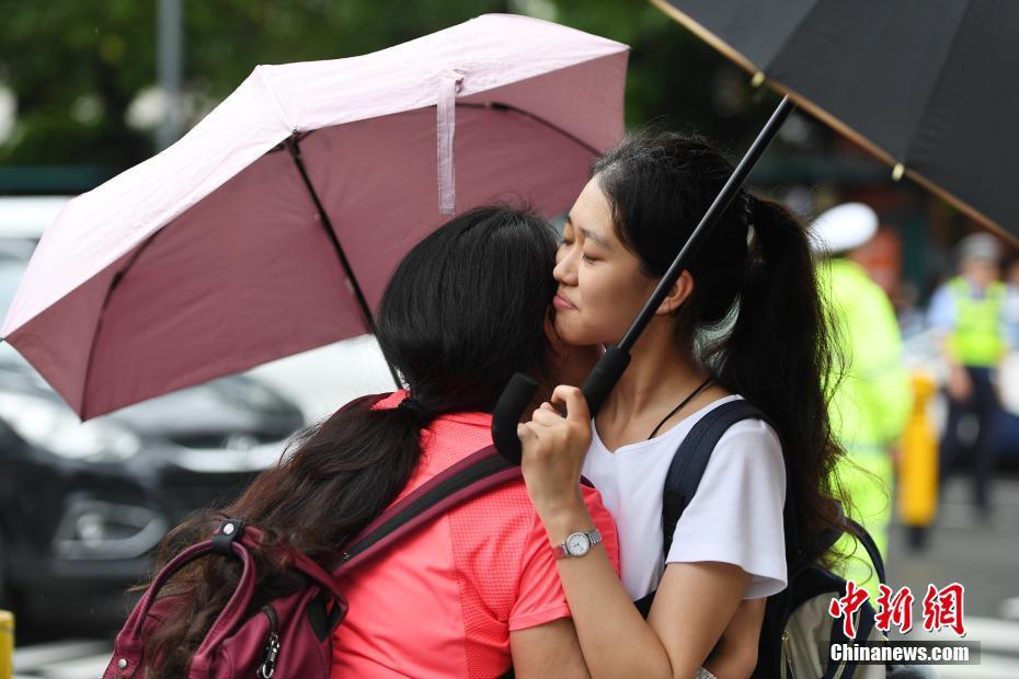 6月7日,2018年高考进入第一天,受第4号台风“艾云尼”外围云系影响,深圳降雨频密。图为福田中学考场外,一对母女相拥祝福。中新社记者 陈文 摄