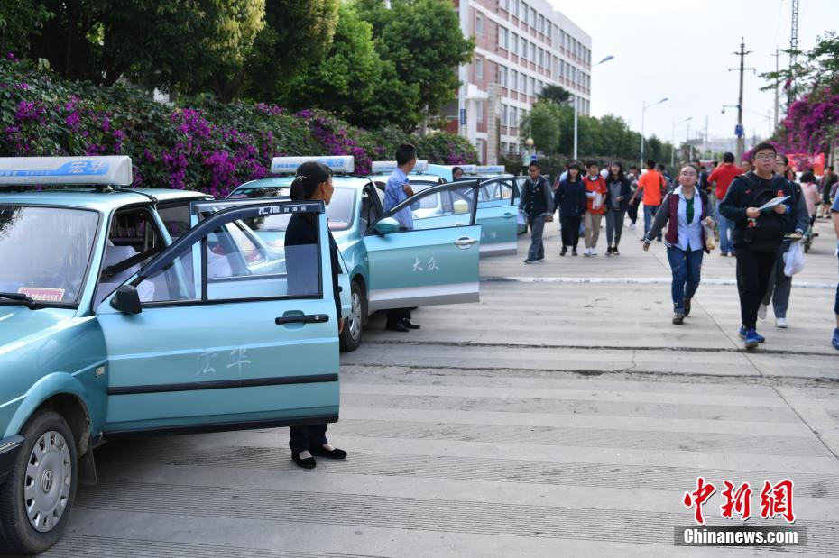 6月8日,爱心送考司机等待考生上车。当日,昆明“雷锋出租汽车队”在昆明第一中学西山学校门前等待参加2018年高考的学生,他们将免费把学生送到各自的考场。据了解,该车队已经坚持“爱心送考”15年不间断。 中新社记者 任东 摄