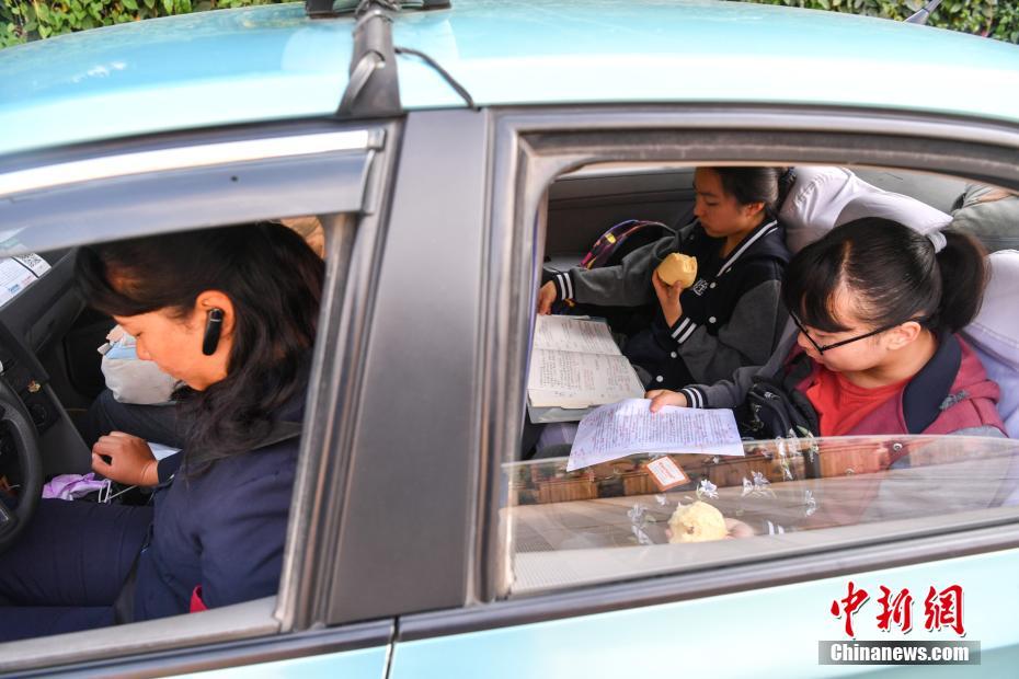 6月8日,考生在“爱心送考”车上复习。当日,昆明“雷锋出租汽车队”在昆明第一中学西山学校门前等待参加2018年高考的学生,他们将免费把学生送到各自的考场。据了解,该车队已经坚持“爱心送考”15年不间断。 中新社记者 任东 摄