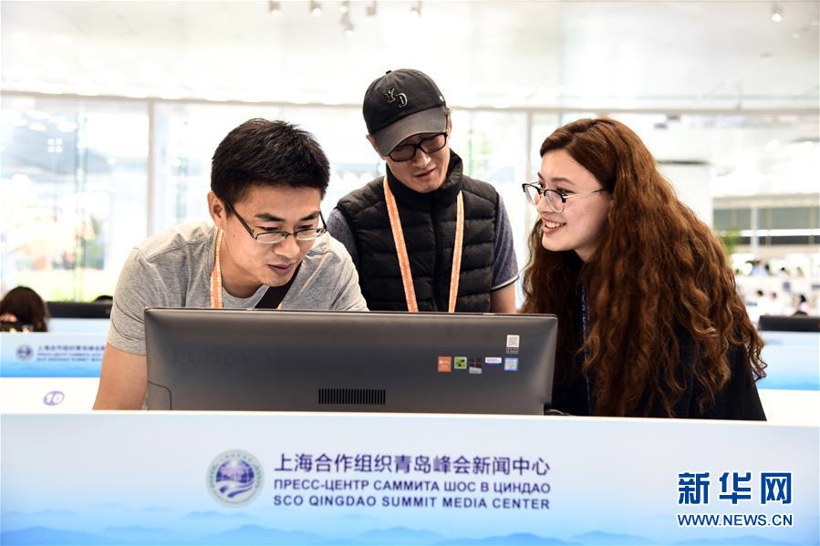 6月8日,在上合青岛峰会新闻中心,珍珠(右一)协助哈萨克斯坦官方媒体记者叶斯姆(中)查询关于青岛的视频资料。 新华社记者郭绪雷摄